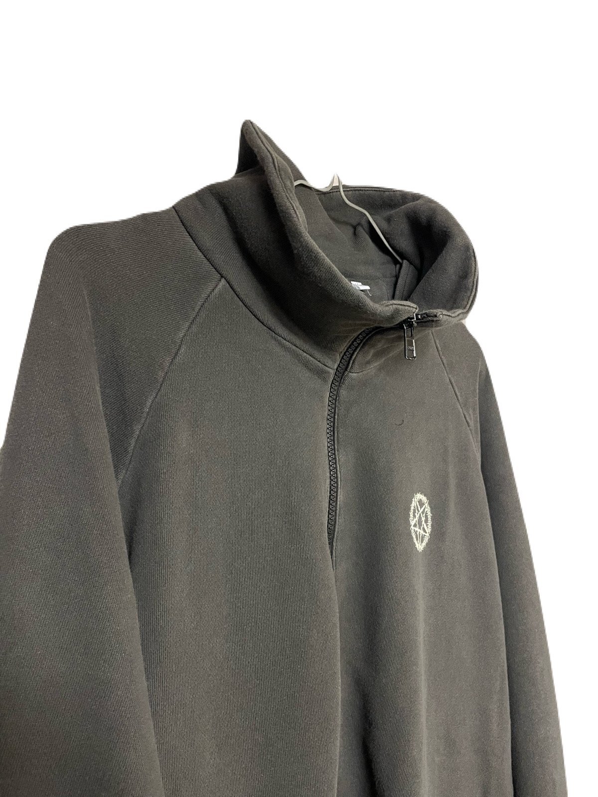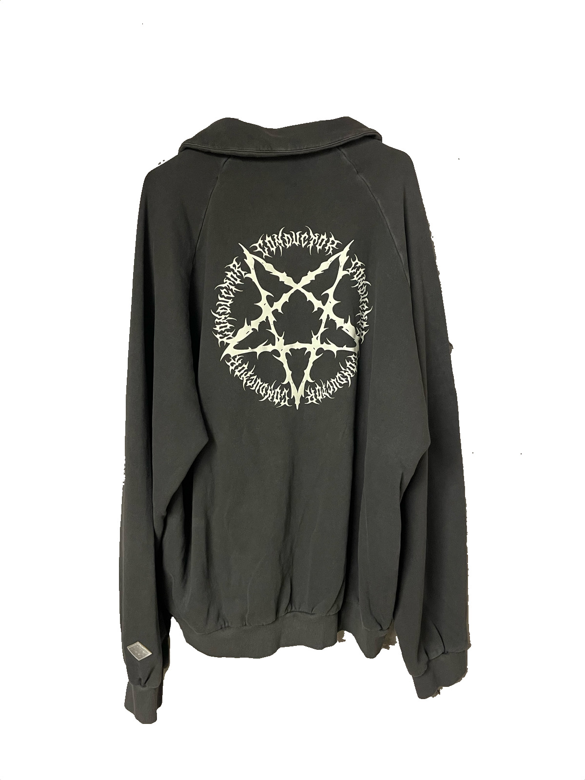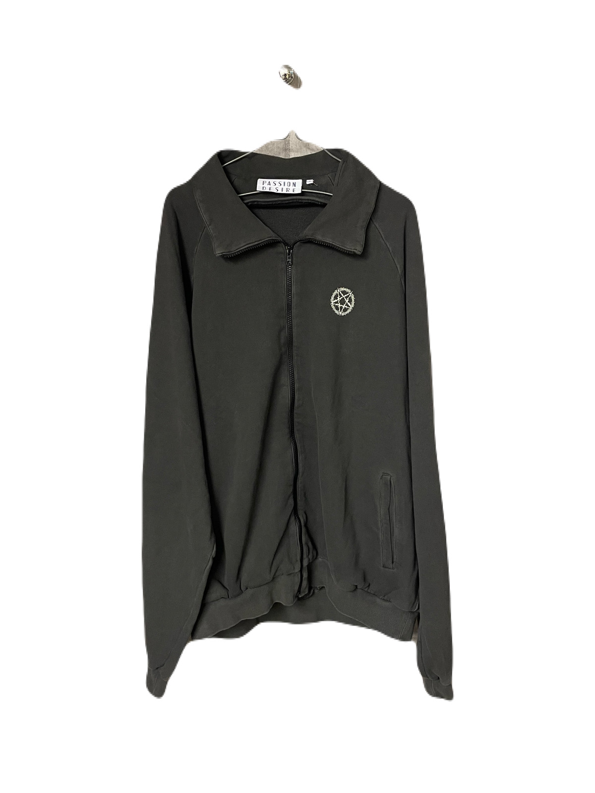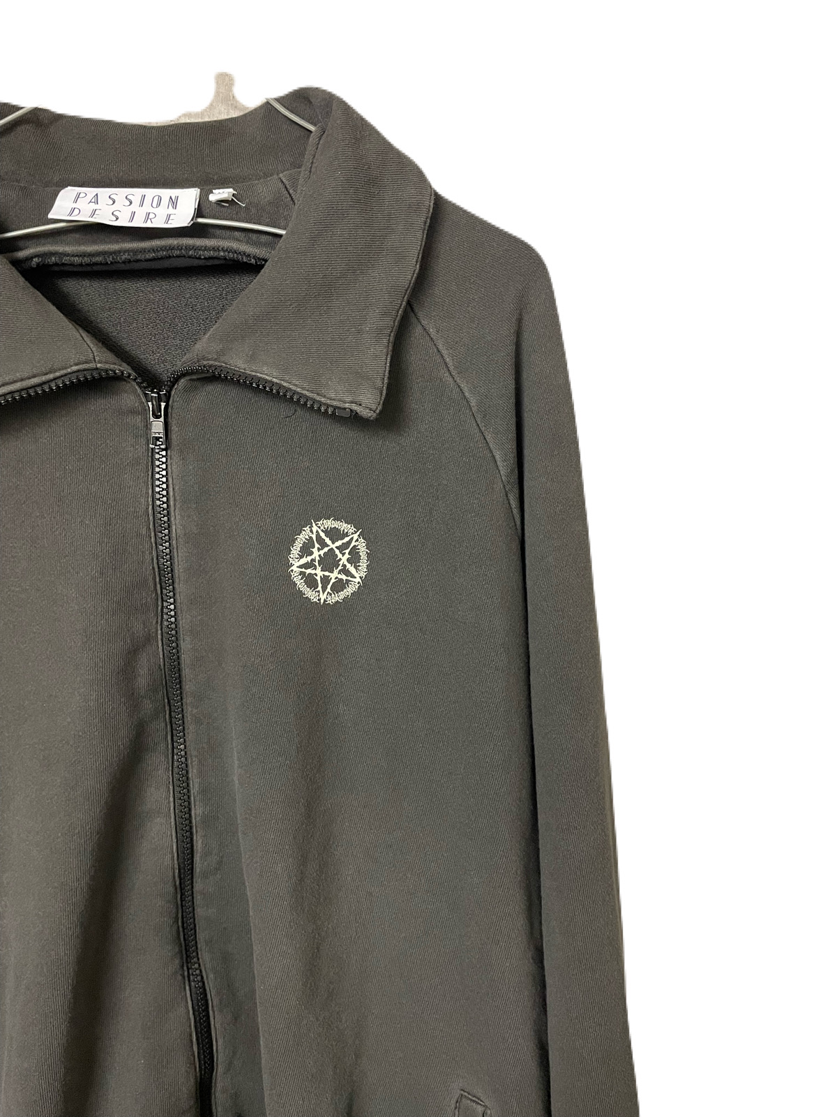後染めとハードな洗い加工を施すことで古着のような風合いを表現したフルジップトラックジャッケット。胸元とバックには逆五芒星グラフィックのひび割れプリントが施されているのが特徴的です。広いシーズンでの着用が可能なアイテムです。