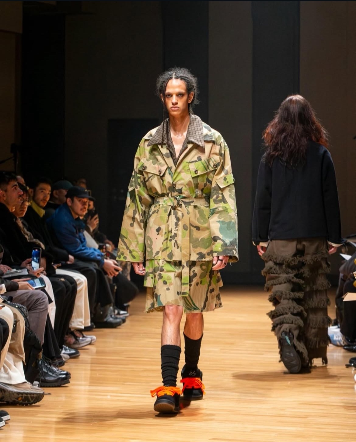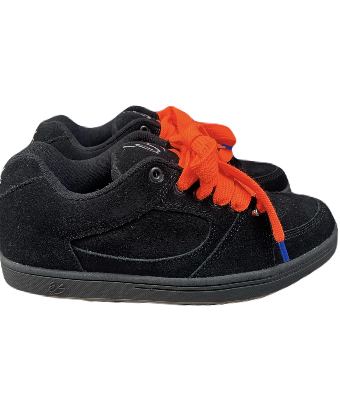 ブラックスエードをベースに、ネオンオレンジの極太シューレースを使用。