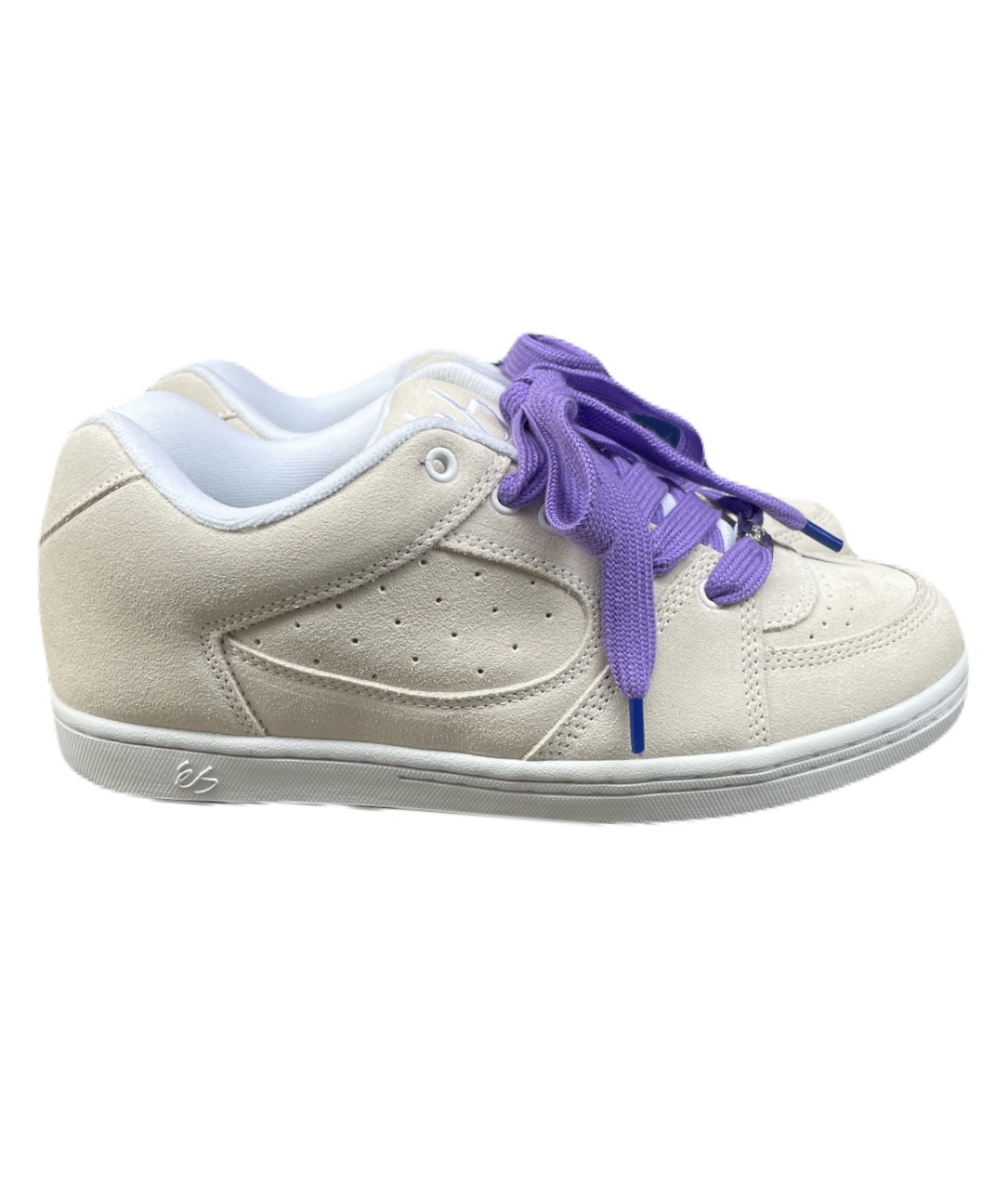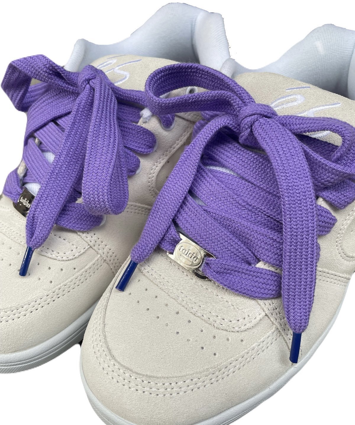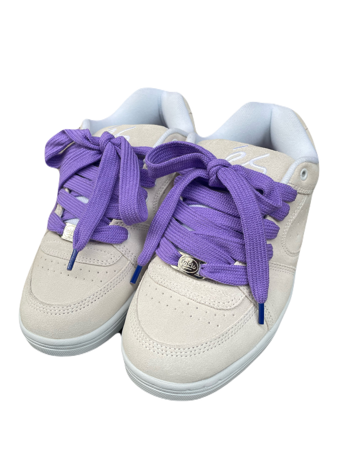 ホワイトスエードをベースに、パープルの極太シューレースを使用。