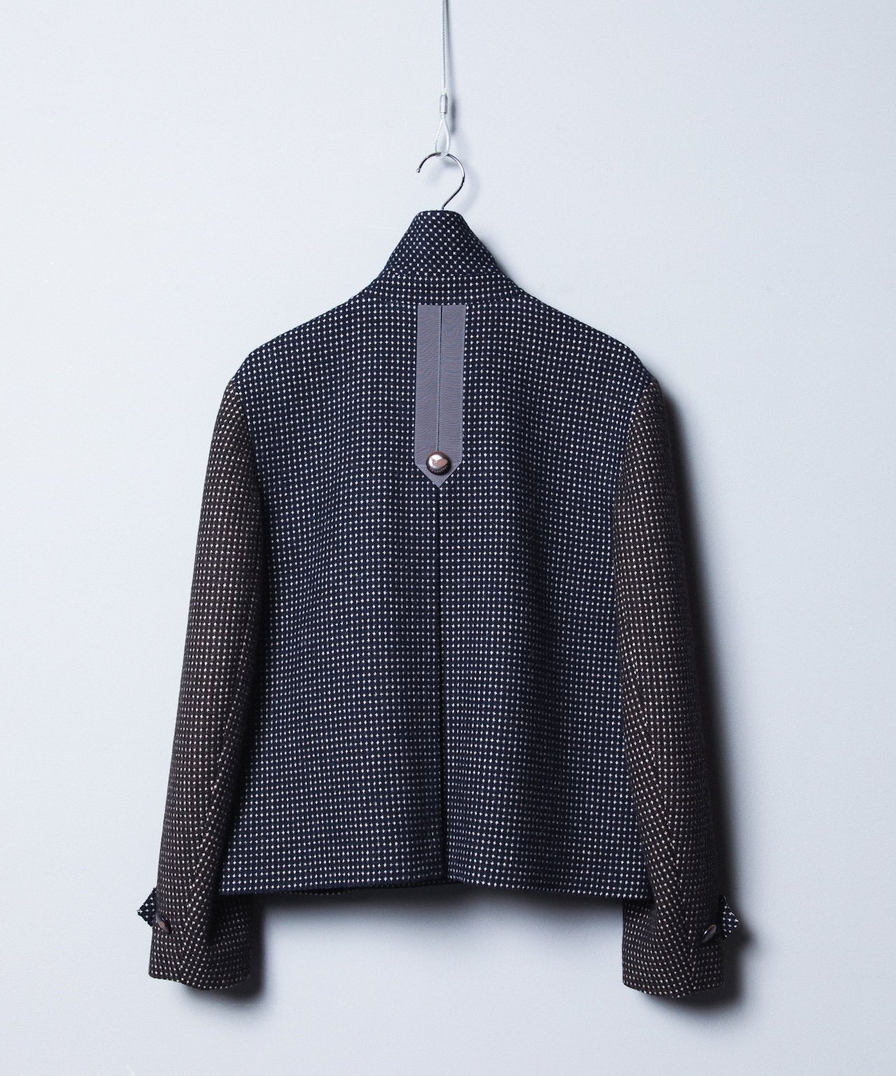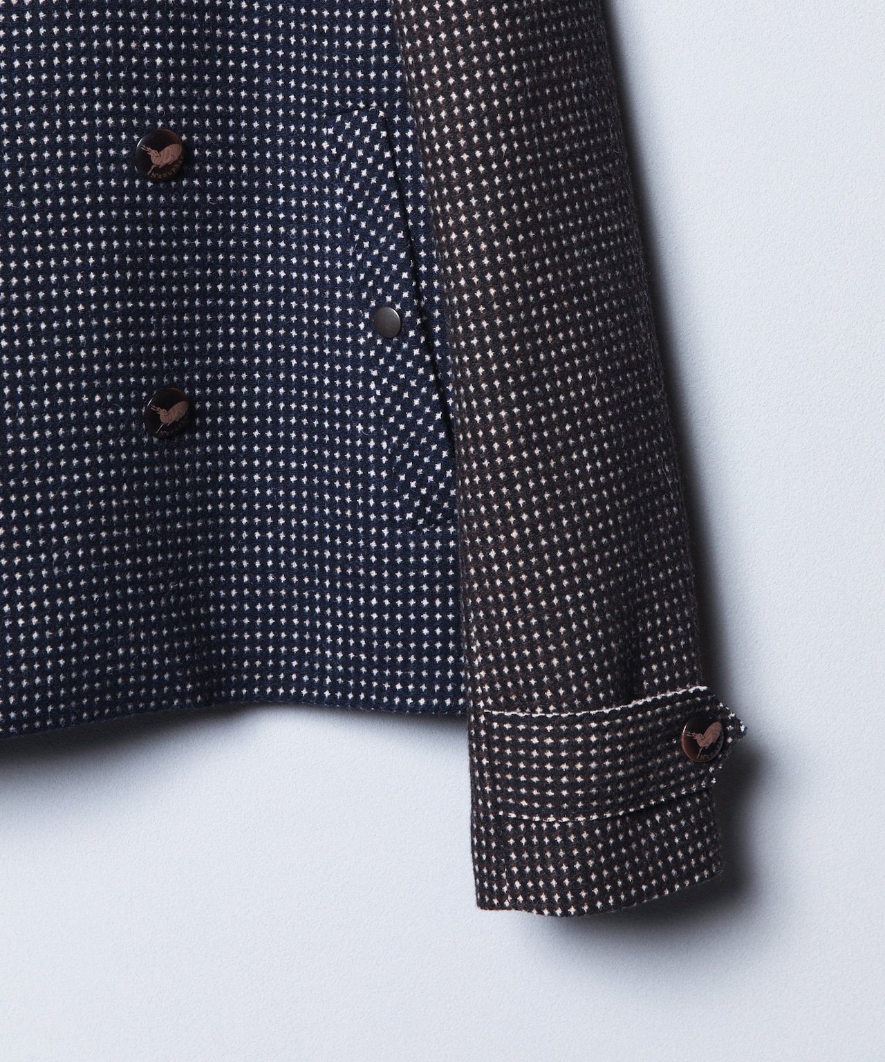 バックには、グログランテープをパイピングで縁取り、動物家紋から着想を得た鹿のロゴ入りスコッチボタンを装飾し、ミリタリーテイストのエポーレット風デザインに。