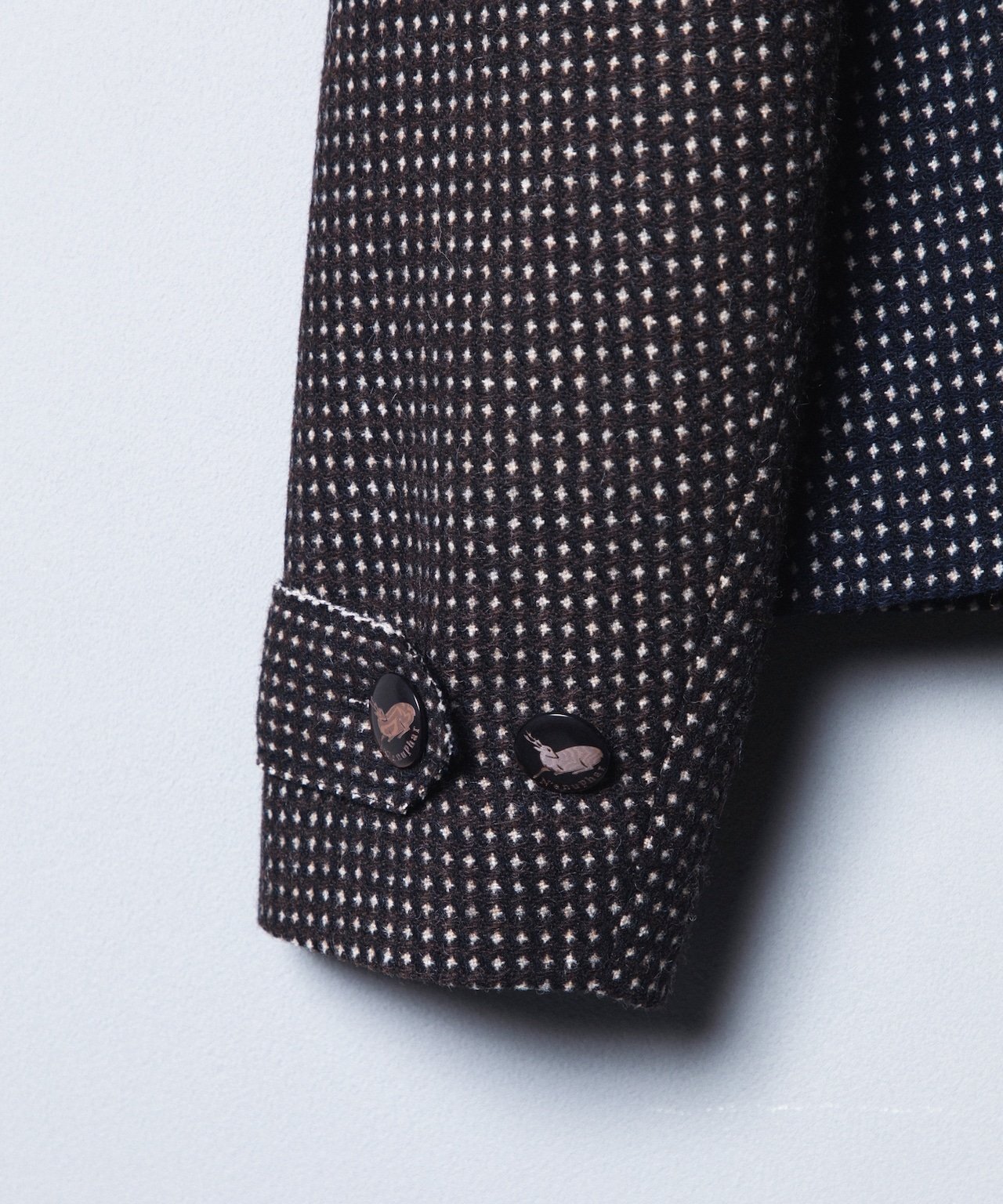前開きや袖口にも同様の鹿柄ロゴ入りスコッチボタンを使用し、大きく取ったプリーツによって、オーストリアの伝統衣装であるチロリアンのディテールを感じさせるデザインに仕上げた。