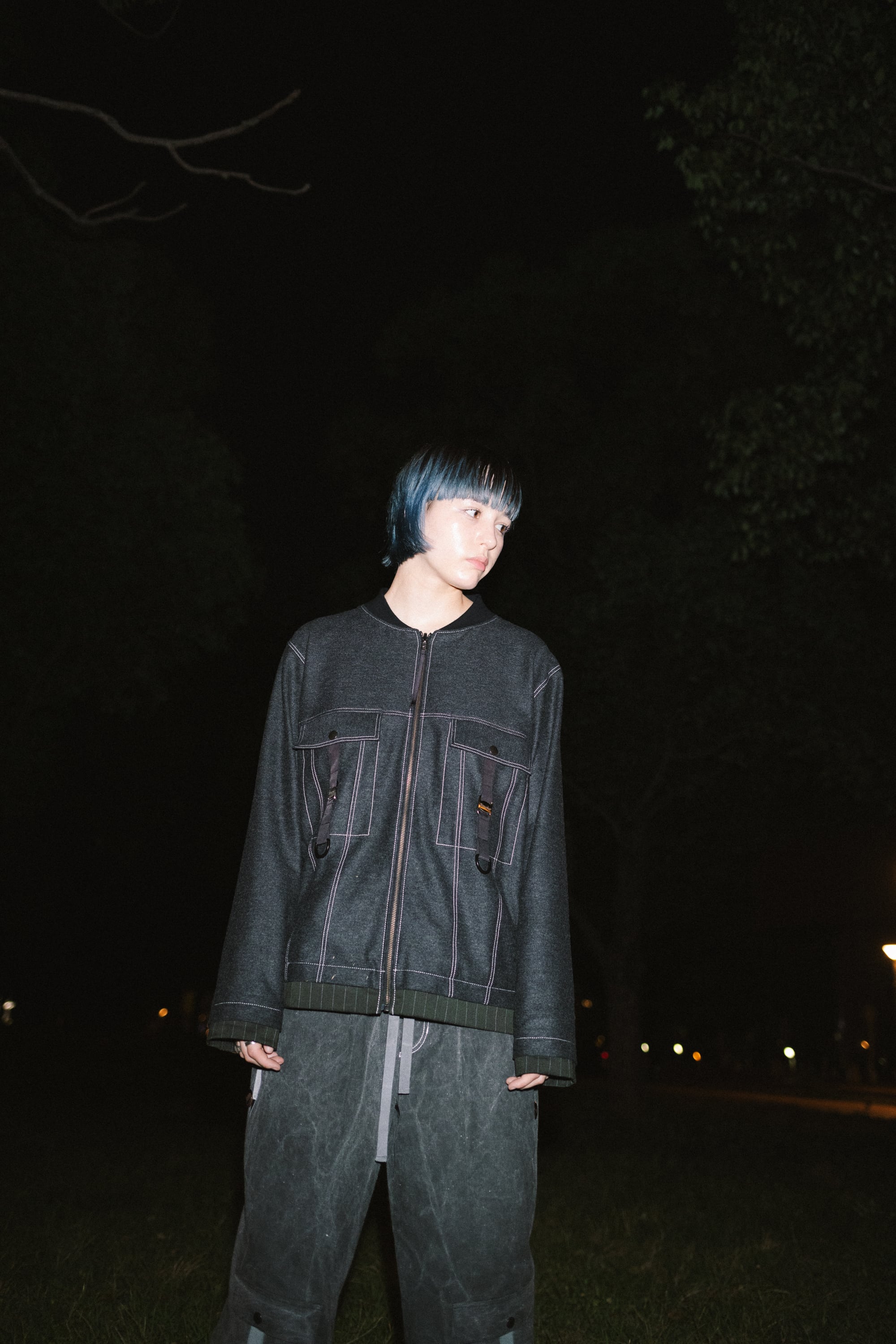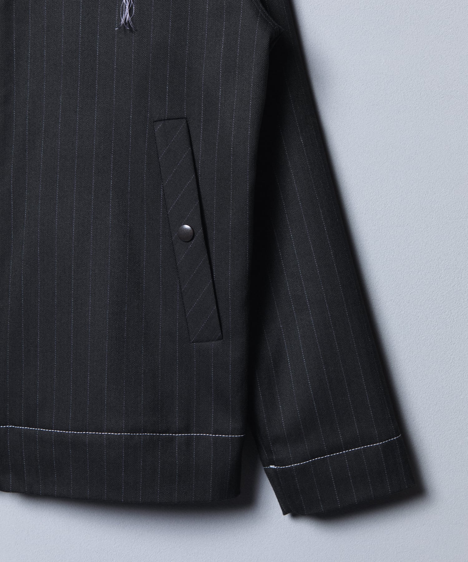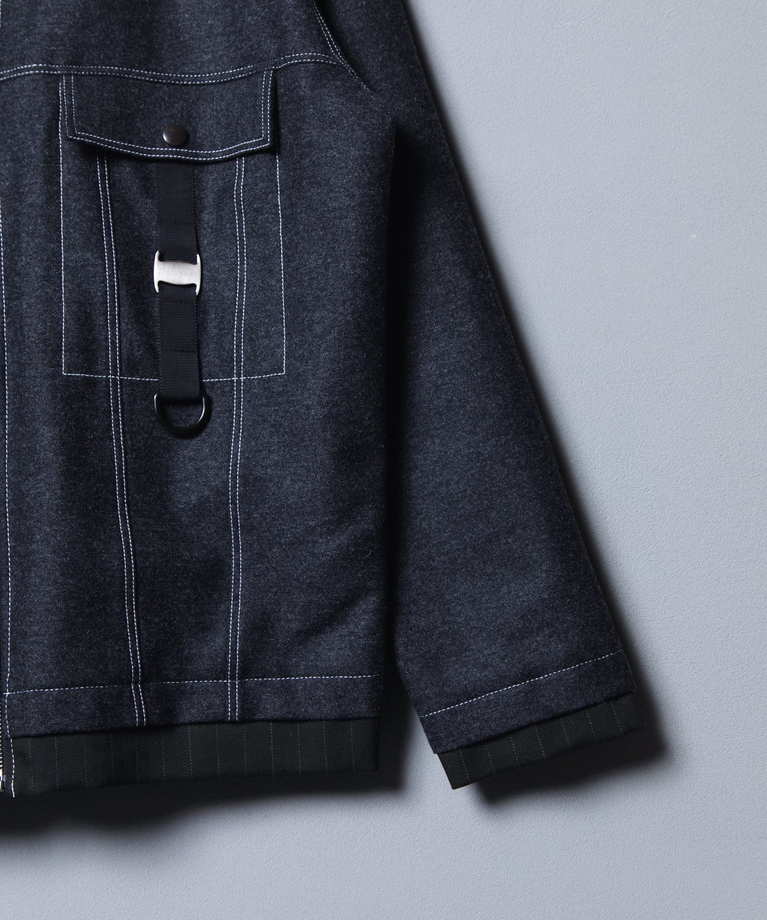 シルエットはややゆったりめ。家紋刺繍が施された、リバーシブル仕様のトラッカーブルゾンコート。
