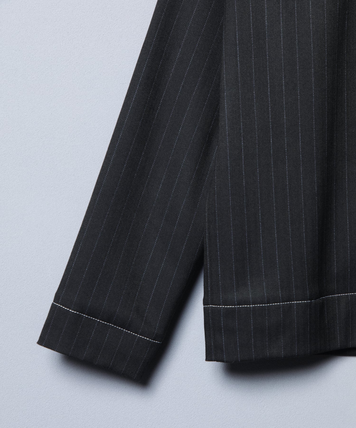 表側の身生地には、ストライプヘリンボン柄が美しく映える、ウールのような滑らかな風合いを持つ、環境に配慮したポリエチレン・レーヨン混紡素材を使用。