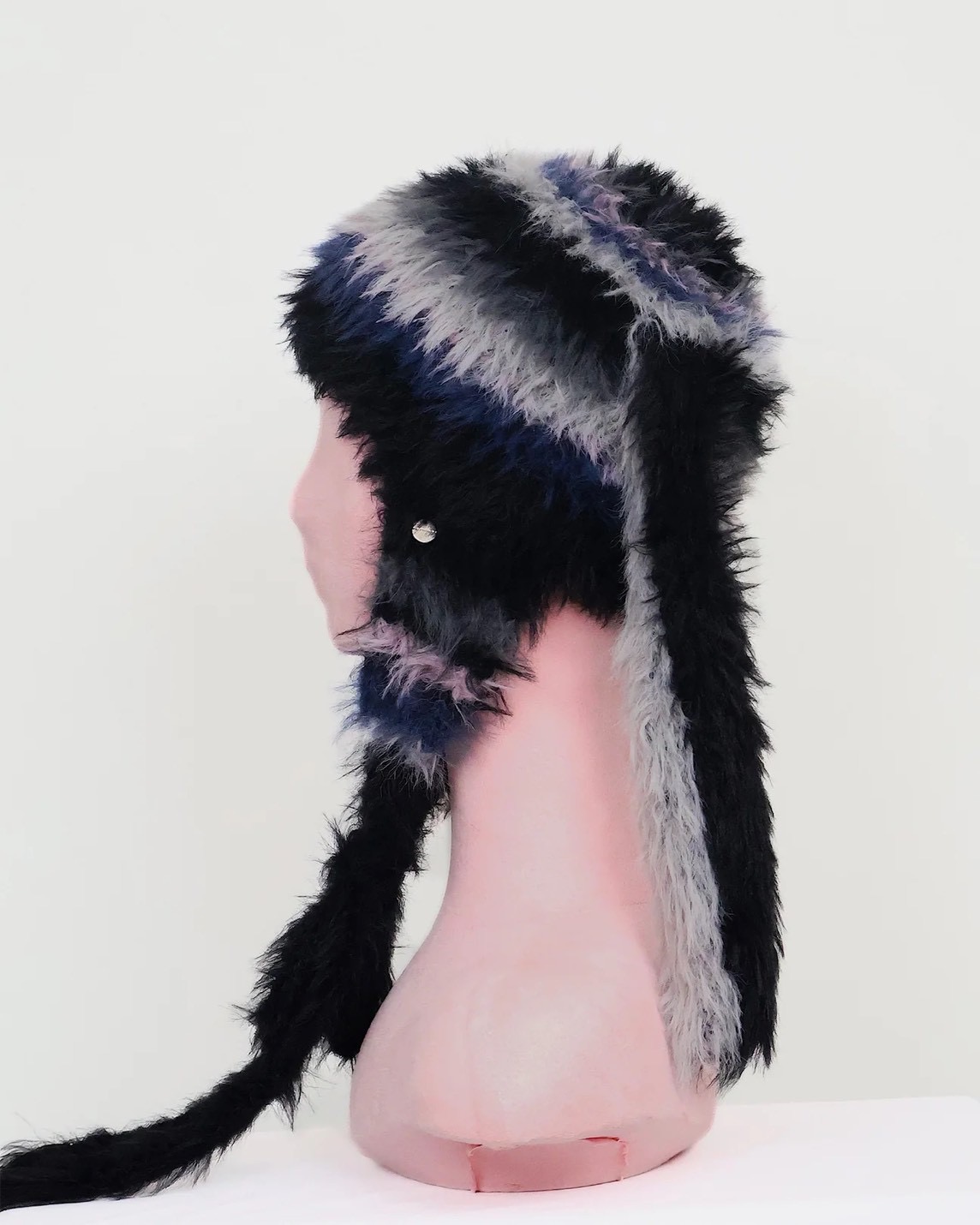 毛足の長いファーヤーンを使用し、マルチボーダーの配色が個性的で暖かみのある仕上がり。