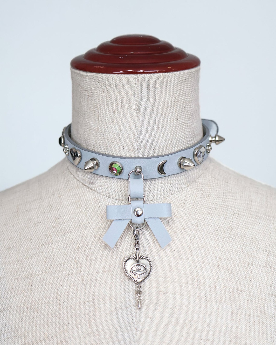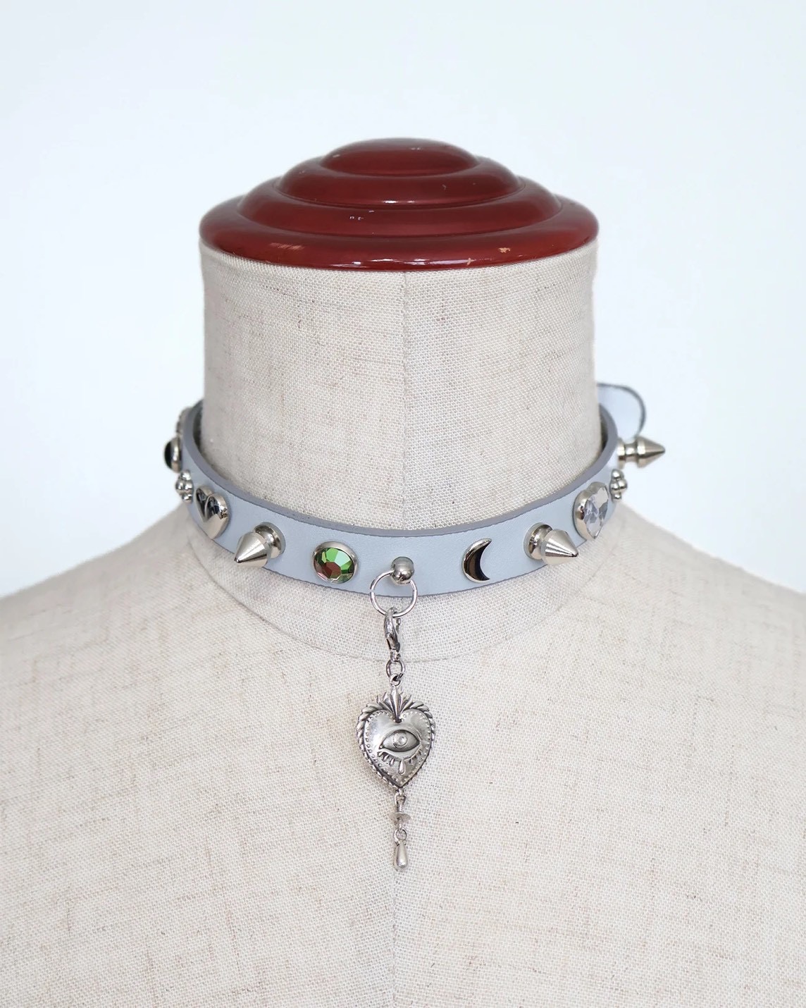 ラインストーンスタッズに、月・花・ハートなどを組み合わせたモチーフが目を引く、印象的なチョーカー。