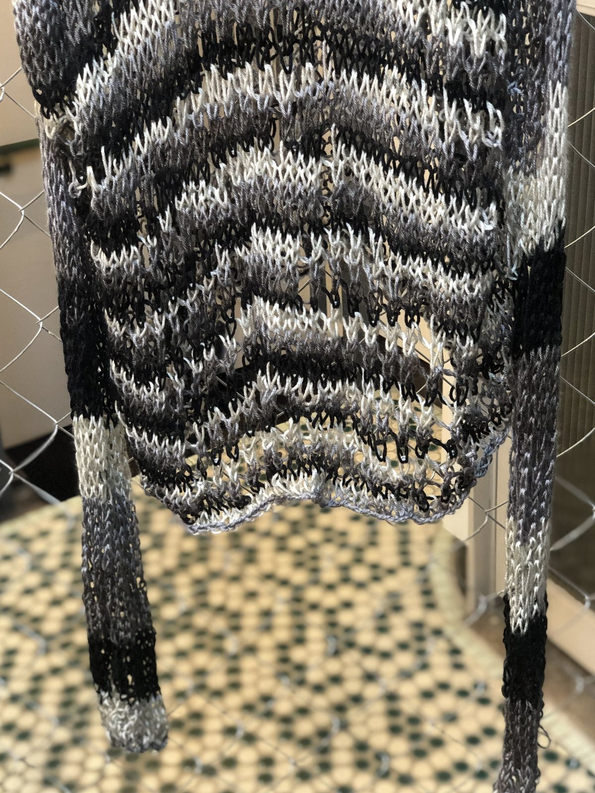 袖が長く、薄地のグラデーションがかかった手編みニット。