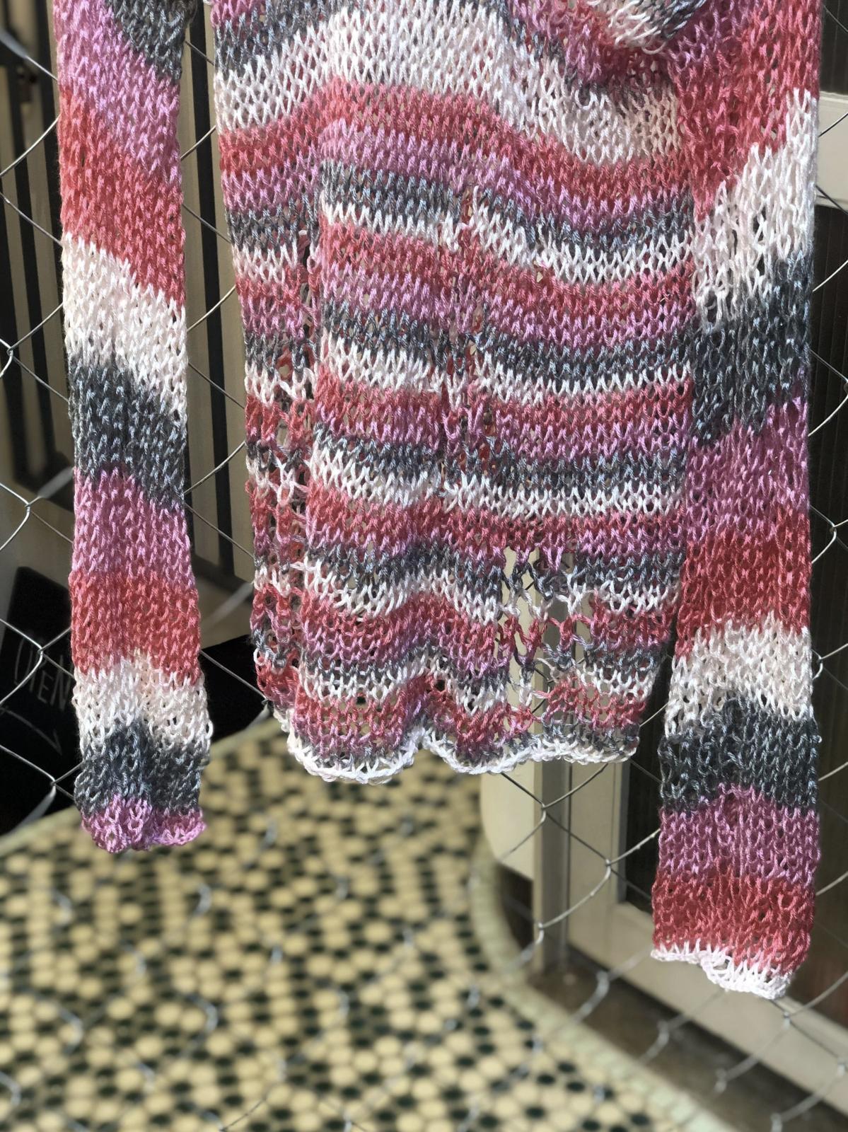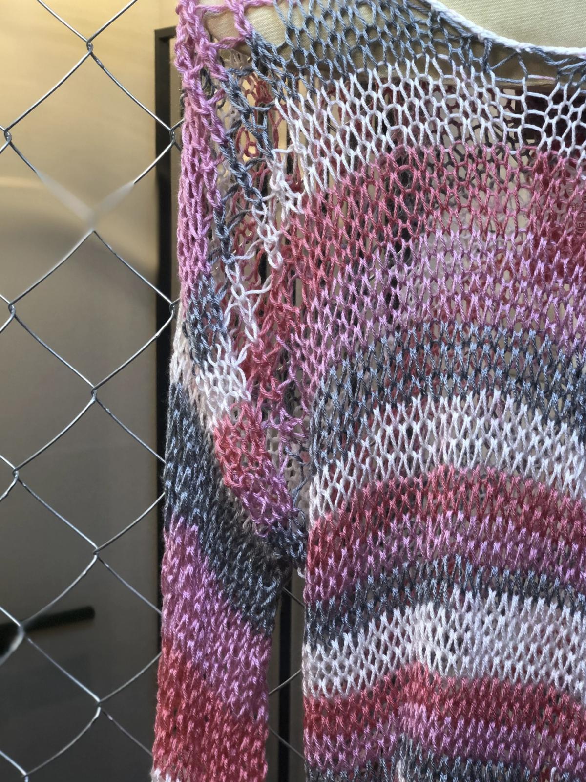 袖が長く、薄地のグラデーションがかかった手編みニット。