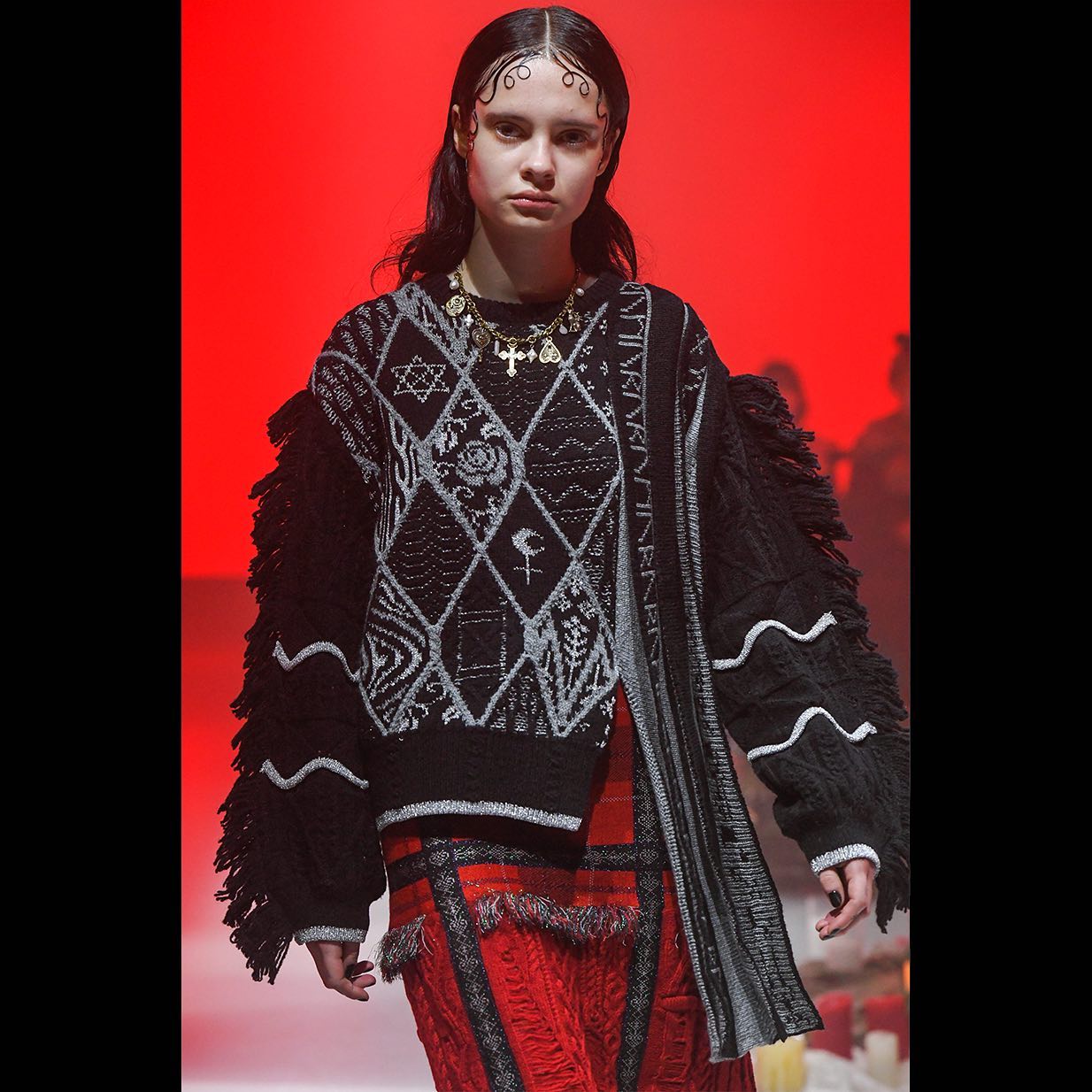 プリーツにはルーン文字でのブランド名や12星座のモチーフをジャカードで施しています。