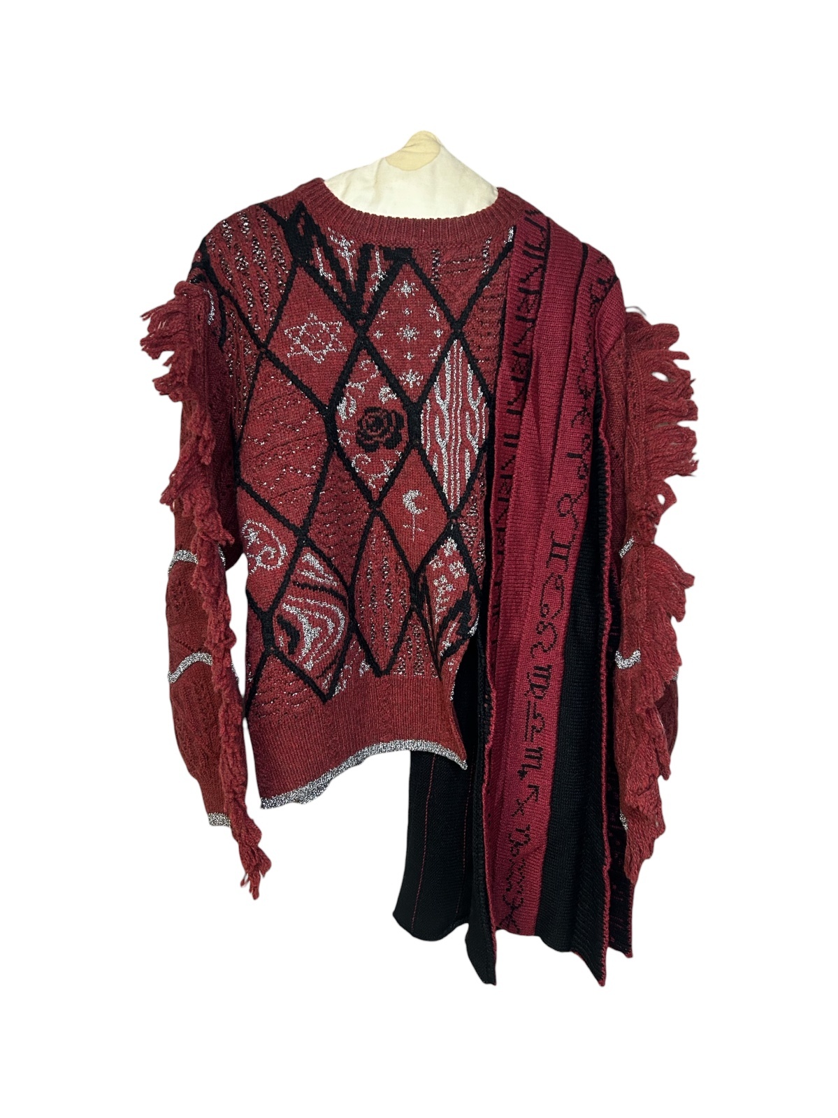 様々なモチーフの編み地とプリーツのような編み地を組み合わせたアシンメトリーのニットプルオーバー。