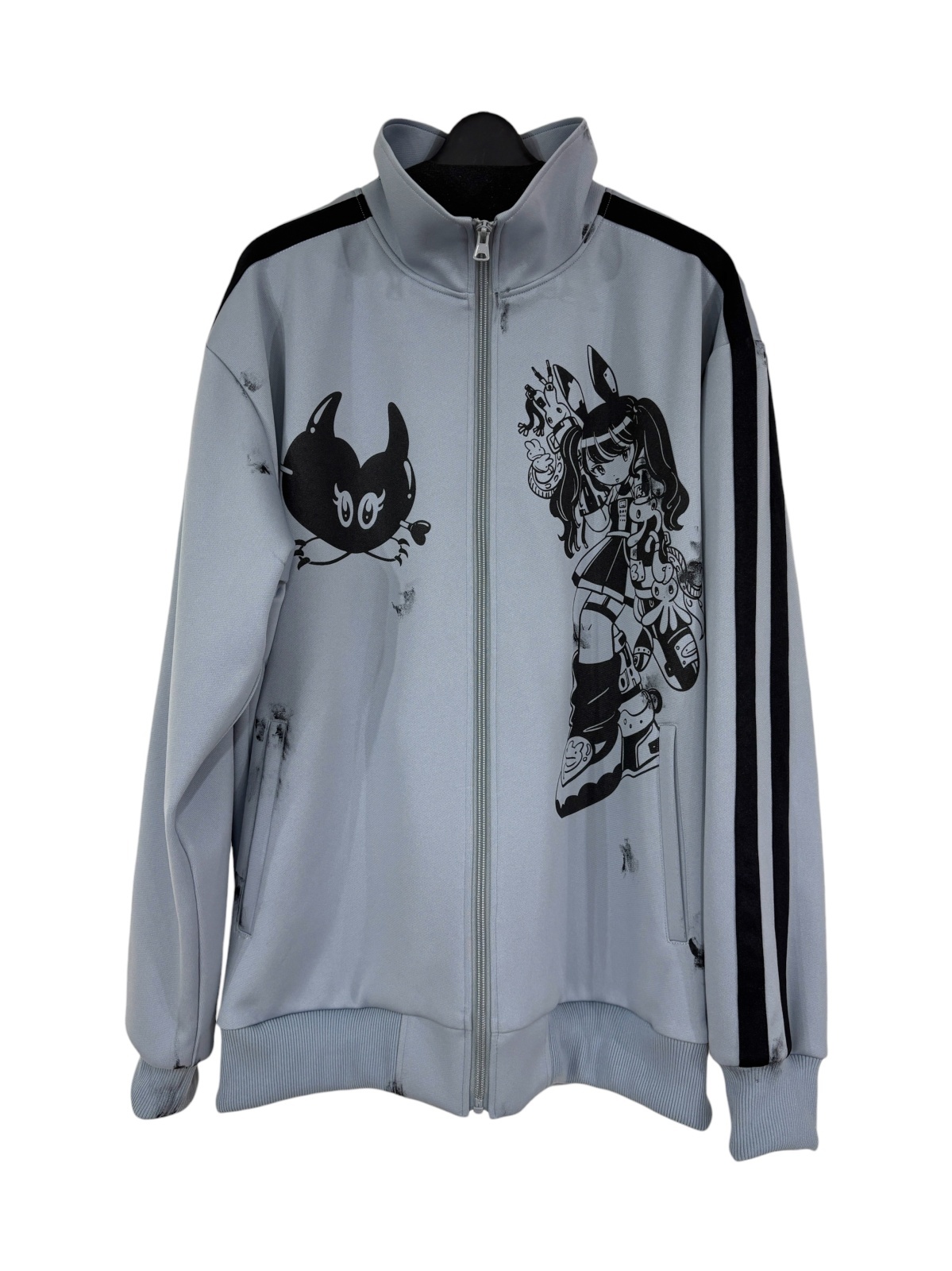 イラストレーターの田中かえさんのイラストが前後にプリントされているトラックジャケット。